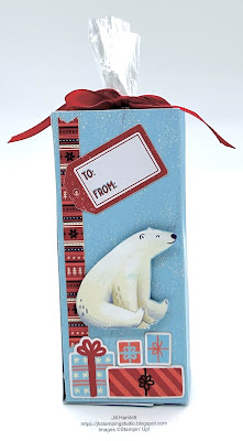 On the long side, score at 1-1/2" (3.8 cm), 3-1/2" (8.9 cm), 5" (12.7 cm), and 7" (17.8 cm); on the short side, score at 1-1/2" (3.8 cm). Fold along the marks to create an open-ended box. Cut bottom score lines and adhere adhesive to secure them together. Add adhesive to last long section to securely close the box. Decorate and fill a cellophane bag with your favorite holiday treat and deliver to a friend!